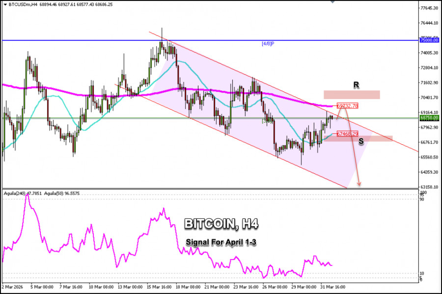 Sinyal Trading untuk BITCOIN pada 1–3 April 2026: jual di bawah $69.732 (EMA 200 - Murray 3/8) Bitcoin diperdagangkan di sekitar $68.750, berada di atas SMA 21 hari, dengan bias bullish tetapi menunjukkan tanda-tanda kelelahan. Saat ini, Bitcoin berada dalam channel tren menurun dan mungkin sedang membentuk
