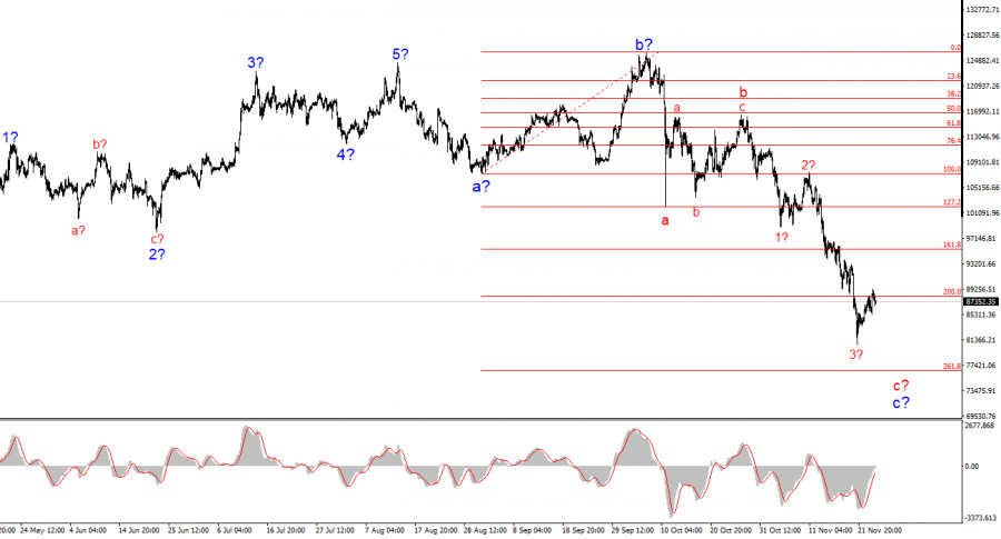 Анализ BTC/USD. 25 ноября. Биткоин может возобновить падение на этой неделе Биткоин за последние две недели потерял 21000$ стоимости. Продолжается построение коррекционной структуры a-b-c, которая приняла не совсем стандартный вид, так как пик волны b находится выше начала волны a. Предполагаемая