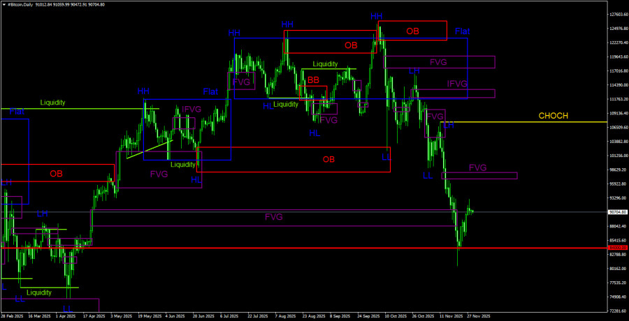 BTC/USD: сценарии динамики на 28.11.2025 На момент публикации данной статьи, пара BTC/USD торговалась вблизи отметки 91820.00, продолжая восстанавливаться после сильного падения, начавшегося еще в прошлом месяце. Всего за октябрь-ноябрь BTC/USD потеряла в стоимости 24%