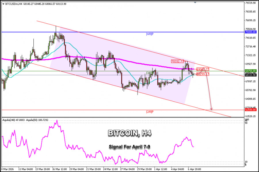 Trading Signals for BITCOIN on April 6-8, 2026: buy above $69,000 (200 EMA - 3/8 Murray) Bitcoin is trading around $69,479, above the 200-day EMA and the 21-day SMA, following a strong technical rebound after hitting the lower band of the uptrend channel formed since March